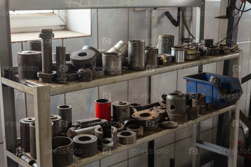 Набор различных инструментов на полках в большой мастерской