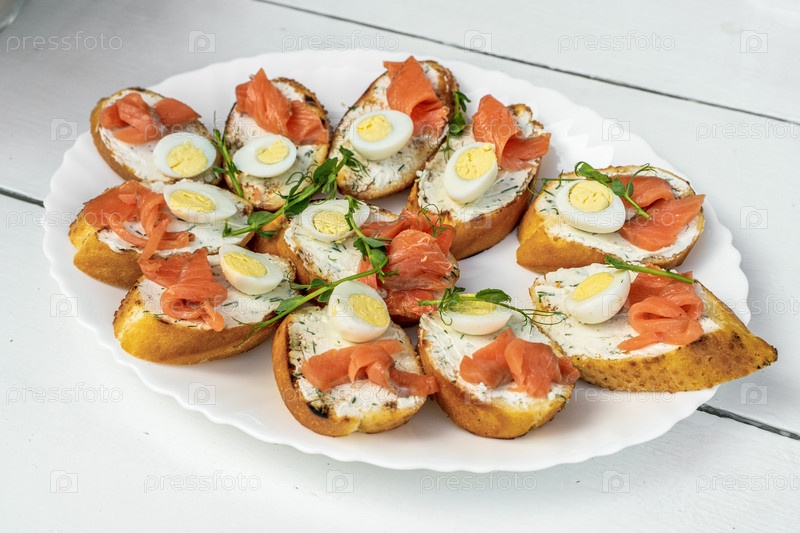Бутерброды с сыром, семгой и перепелиным яйцом
