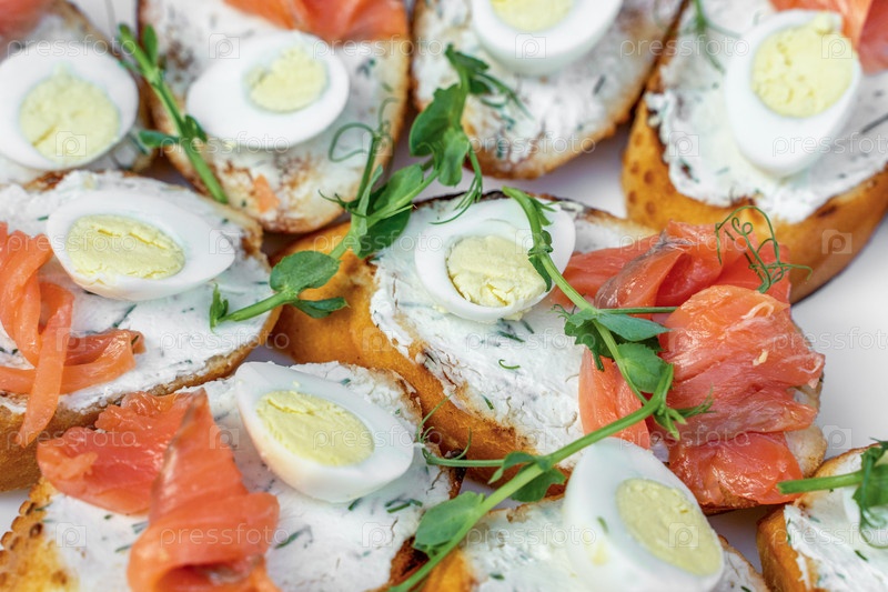 Бутерброды с семгой, сыром, перепелиными яйцами и зеленью