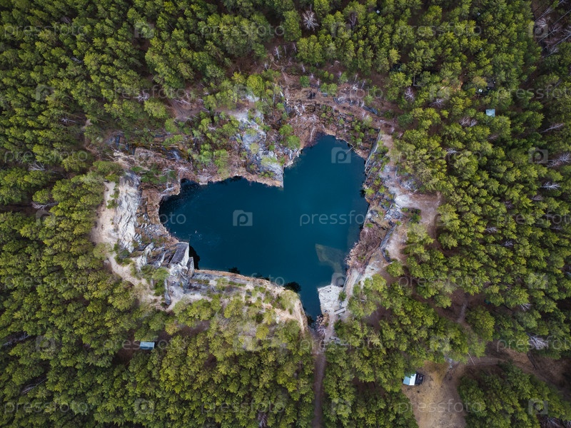 Голубое озеро в форме сердца посреди зеленого леса с высоты птичьего полета. Съемка с воздуха