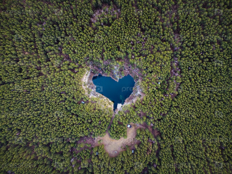 Голубое озеро в форме сердца посреди зеленого леса с высоты птичьего полета. Съемка с воздуха