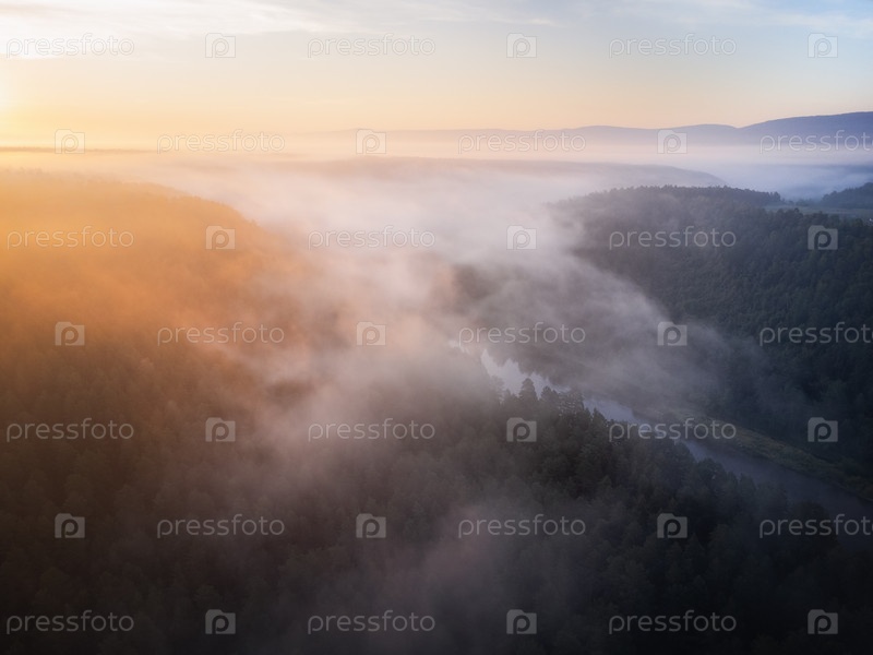Туман над рекой в тайге ранним утром на рассвете. Съемка с воздуха