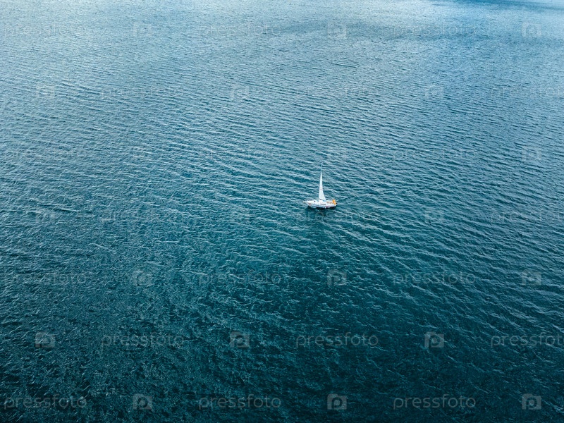 Белая парусная яхта в голубой воде озера солнечным летним днем. Съемка с воздуха