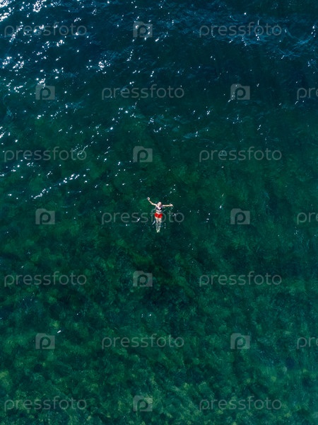 Девушка плавает в прозрачной и чистой воде озера Тургояк. Съемка с воздуха