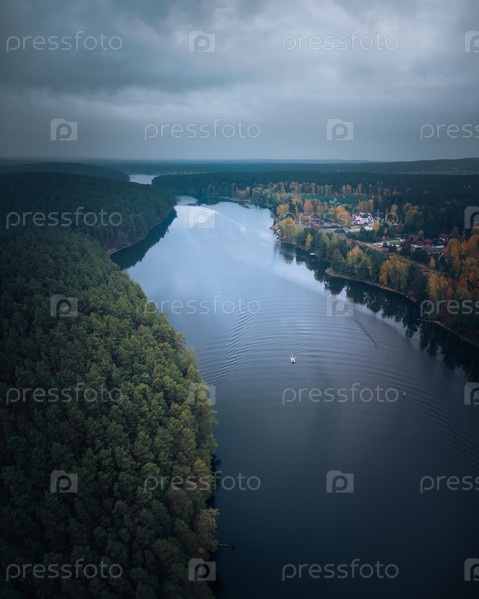 Вид с высоты птичьего полета на реку и лес в пасмурную погоду
