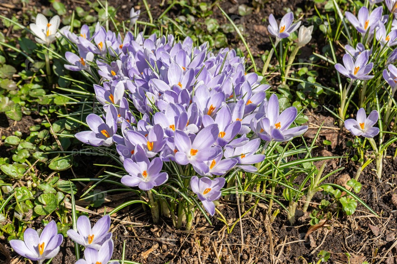 Весенние цветы и природа. Крупным планом фиолетовые цветы крокуса с оранжевым пестиком