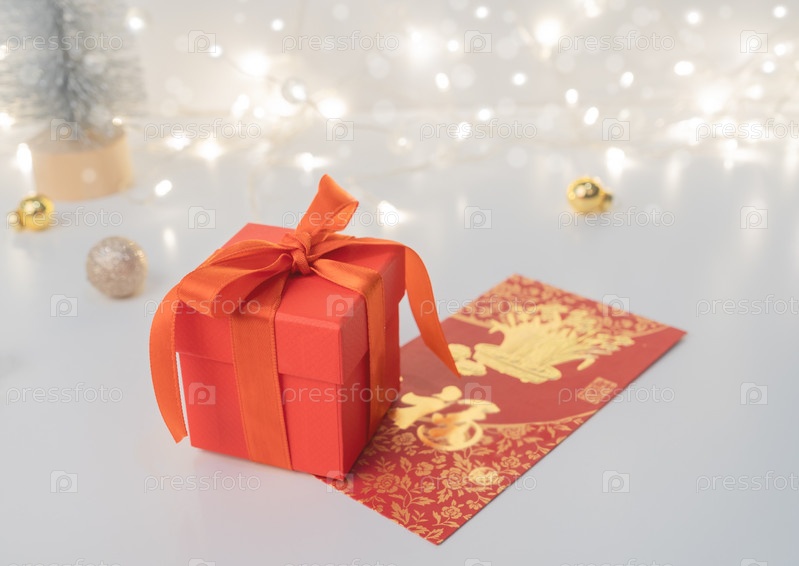 Поздравление с Новым годом с красным китайским конвертом и подарочной коробкой