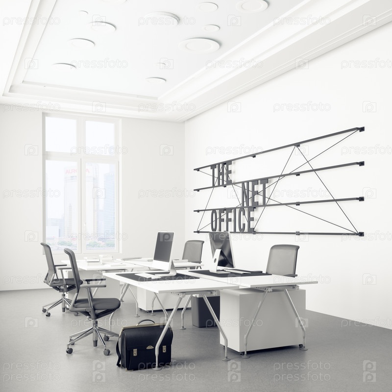 Современный интерьер офиса с белыми стенами, бетонным полом, белыми компьютерными столами и черными стульями. макет 3D-рендеринга