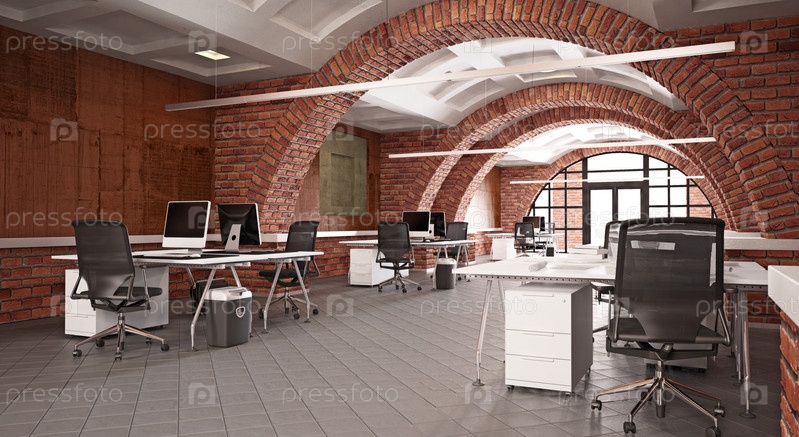 Интерьер современного офиса с кирпичными стенами