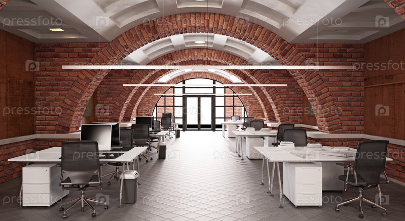 Интерьер современного офиса с кирпичными стенами
