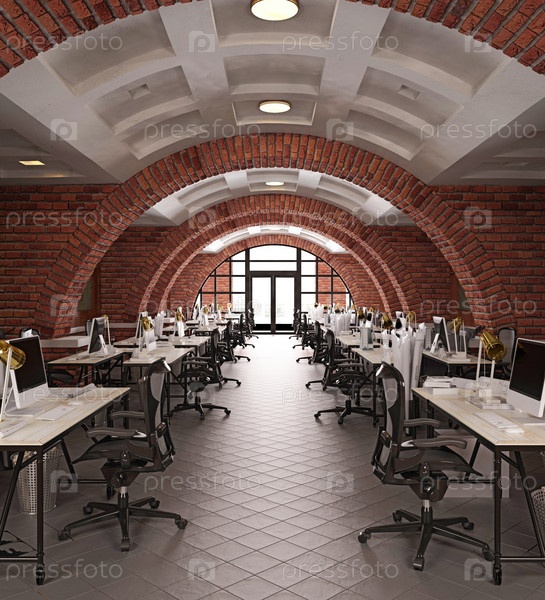 Интерьер современного офиса с кирпичными стенами и полом. 3D-рендеринг