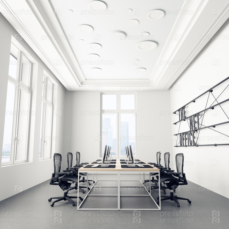 Современный интерьер офиса с белыми стенами, бетонным полом, белыми компьютерными столами и черными стульями. макет 3D-рендеринга