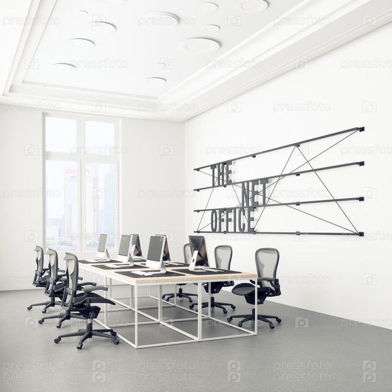 Современный интерьер офиса с белыми стенами, бетонным полом, белыми компьютерными столами и черными стульями. макет 3D-рендеринга