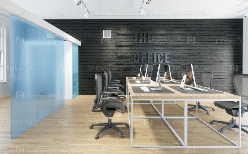 3D-иллюстрация современного дизайна интерьера офиса. рабочее место