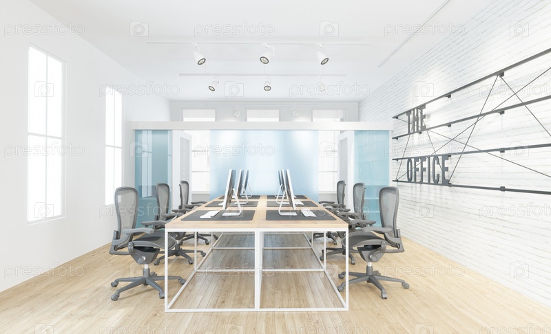 Современный интерьер офиса с белыми стенами, деревянным полом, рядами компьютерных столов и стульев. макет 3D-рендеринга