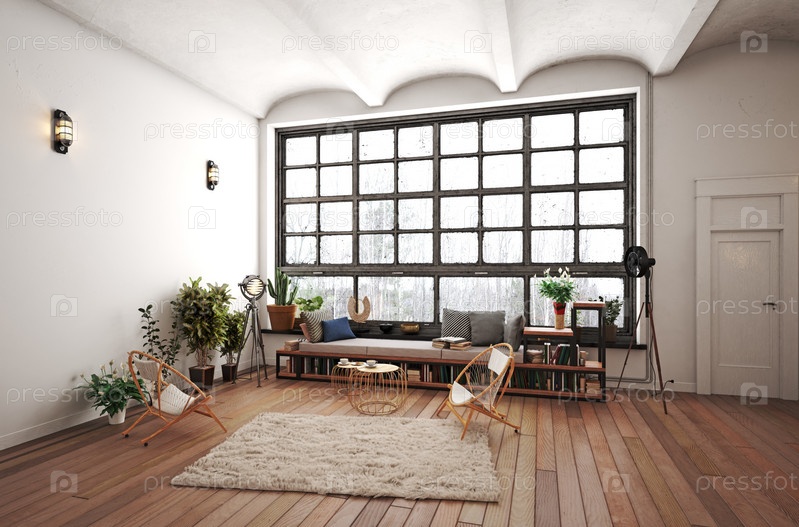 Современный дизайн интерьера гостиной с мебелью. 3D-рендеринг изображений