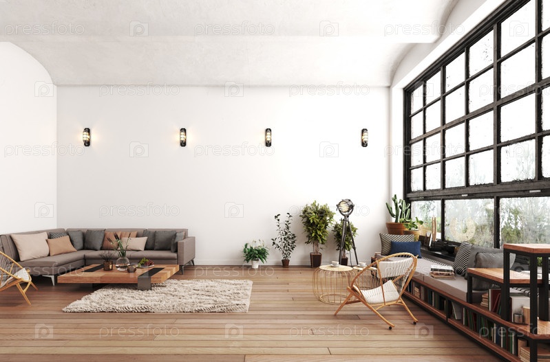 Современный дизайн интерьера гостиной с мебелью. 3D-рендеринг изображений