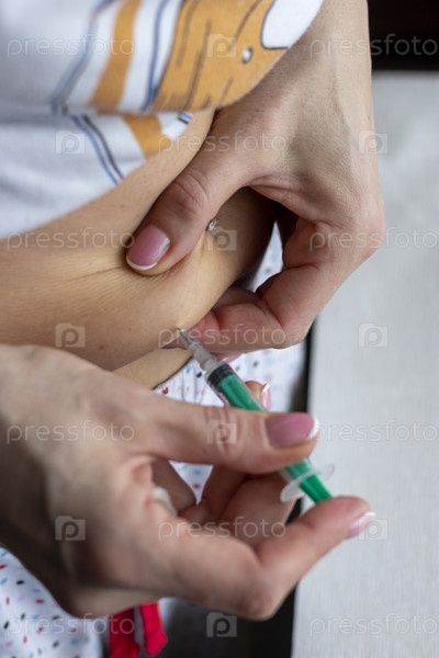 Крупный план женщины с красивыми руками, готовящей гормональные лекарства и делающей себе инъекцию в живот с проколотым пупком. Здравоохранение