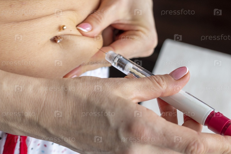 Крупный план женщины с красивыми руками, готовящей гормональные лекарства и делающей себе инъекцию в живот с проколотым пупком. Здравоохранение
