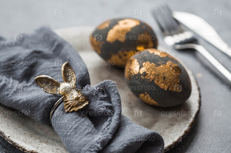 Баннер. Сервировка стола. Модная бетонная тарелка с кроликом на салфетке, пасхальные яйца с позолотой, перья на сером фоне. Концепция праздника Светлой Пасхи для кафе и ресторанов