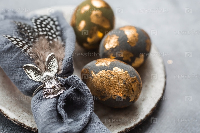 Баннер. Сервировка стола. Модная бетонная тарелка с кроликом на салфетке, пасхальные яйца с позолотой, перья на сером фоне. Концепция праздника Светлой Пасхи для кафе и ресторанов