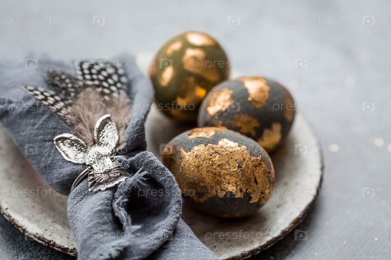Баннер. Сервировка стола. Модная бетонная тарелка с кроликом на салфетке, пасхальные яйца с позолотой, перья на сером фоне. Концепция праздника Светлой Пасхи для кафе и ресторанов