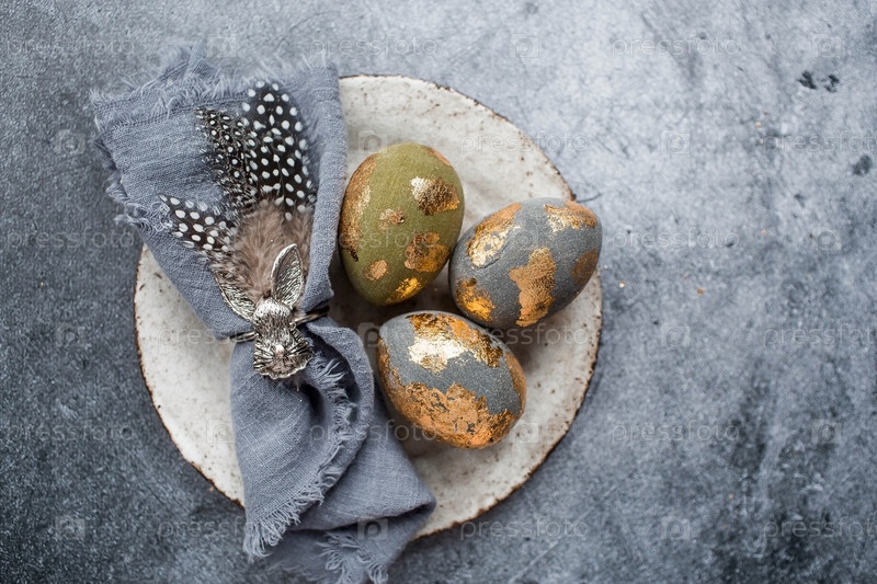 Баннер. Сервировка стола. Модная бетонная тарелка с кроликом на салфетке, пасхальные яйца с позолотой, перья на сером фоне. Концепция праздника Светлой Пасхи для кафе и ресторанов