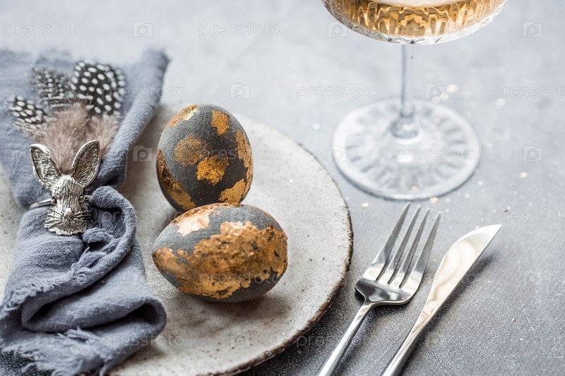 Баннер. Сервировка стола. Модная бетонная тарелка с кроликом на салфетке, пасхальные яйца с позолотой, перья на сером фоне. Концепция праздника Светлой Пасхи для кафе и ресторанов