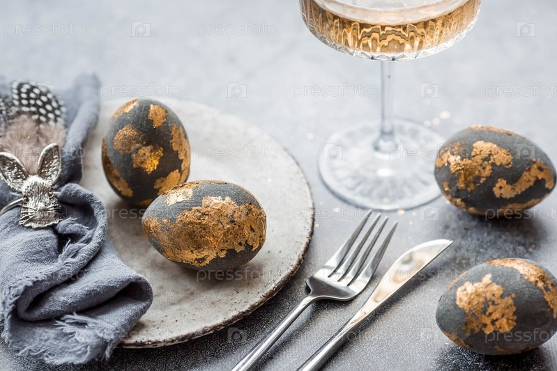 Баннер. Сервировка стола. Модная бетонная тарелка с кроликом на салфетке, пасхальные яйца с позолотой, перья на сером фоне. Концепция праздника Светлой Пасхи для кафе и ресторанов