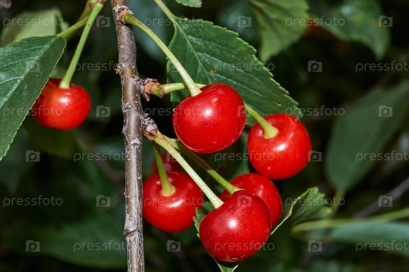 Плоды вишни на фоне зеленых листьев. В саду созревает вишня