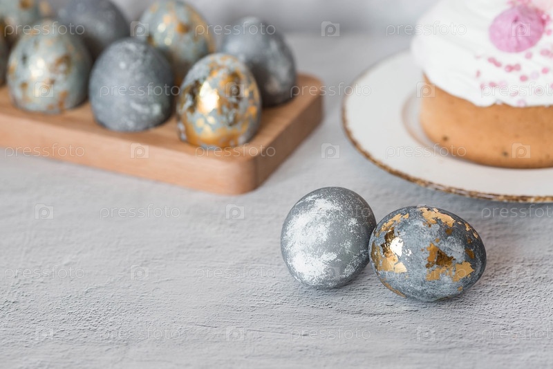 Стильные серые пасхальные яйца из мрамора и бетона с золотой поталой на сером фоне. Окраска яиц натуральным красителем чай каркаде. . Концепция счастливой Пасхи