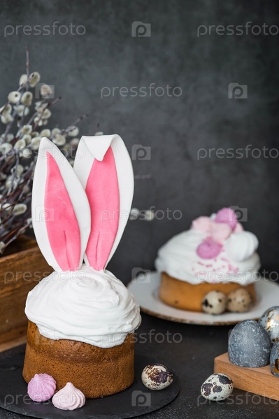 Красивый стильный натюрморт. Пасхальный кулич с кроличьими ушками, безе, зефиром, пасхальными яйцами и веточками ивы на темном фоне. счастливой Пасхи 2024