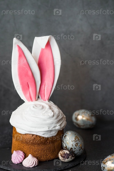 Красивый стильный натюрморт. Пасхальный кулич с кроличьими ушками, безе, зефиром, пасхальными яйцами и веточками ивы на темном фоне. счастливой Пасхи 2024