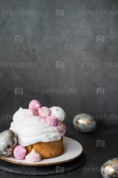 Красивый стильный натюрморт. Пасхальный кулич с безе, зефиром и пасхальными яйцами на темном фоне. счастливой Пасхи 2024