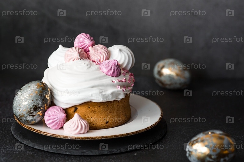 Красивый стильный натюрморт. Пасхальный кулич с безе, зефиром и пасхальными яйцами на темном фоне. счастливой Пасхи 2024