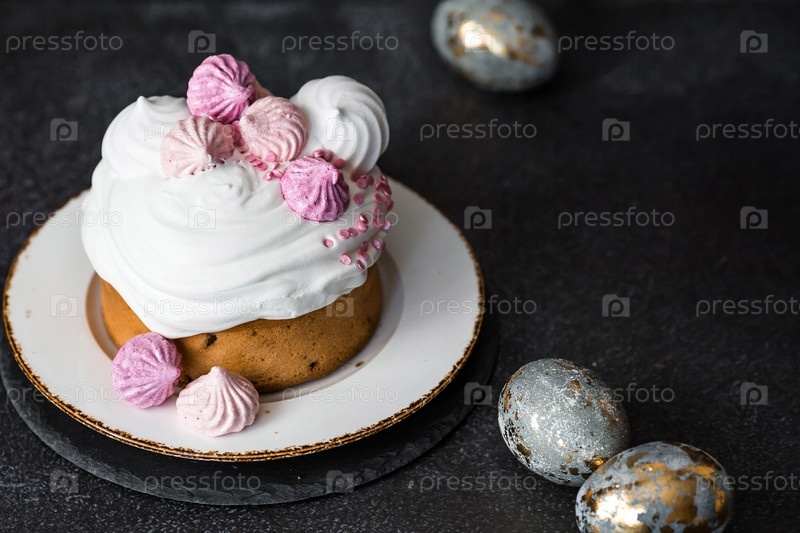Красивый стильный натюрморт. Пасхальный кулич с безе, зефиром и пасхальными яйцами на темном фоне. счастливой Пасхи 2024