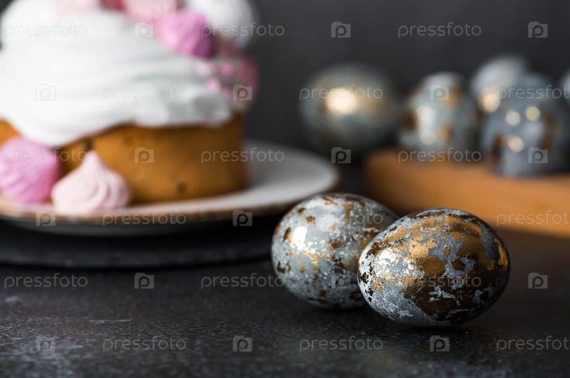 Красивый стильный натюрморт. Пасхальный кулич с безе, зефиром и пасхальными яйцами на темном фоне. счастливой Пасхи 2024