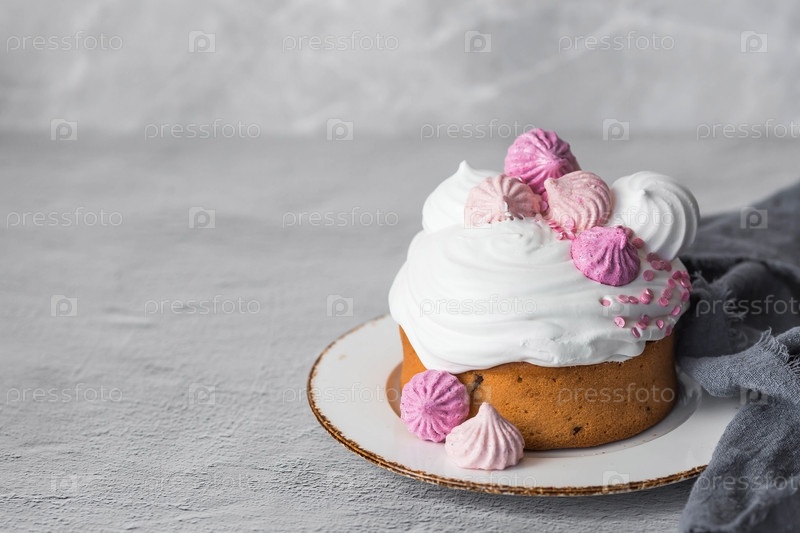 Красивый стильный натюрморт. Пасхальный кулич с безе, зефиром, пасхальными яйцами и веточками ивы на светлом бетонном фоне. счастливой Пасхи 2024