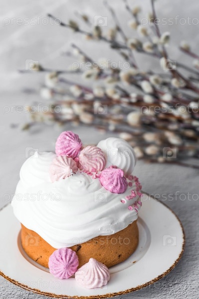Красивый стильный натюрморт. Пасхальный кулич с безе, зефиром, пасхальными яйцами и веточками ивы на светлом бетонном фоне. счастливой Пасхи 2024