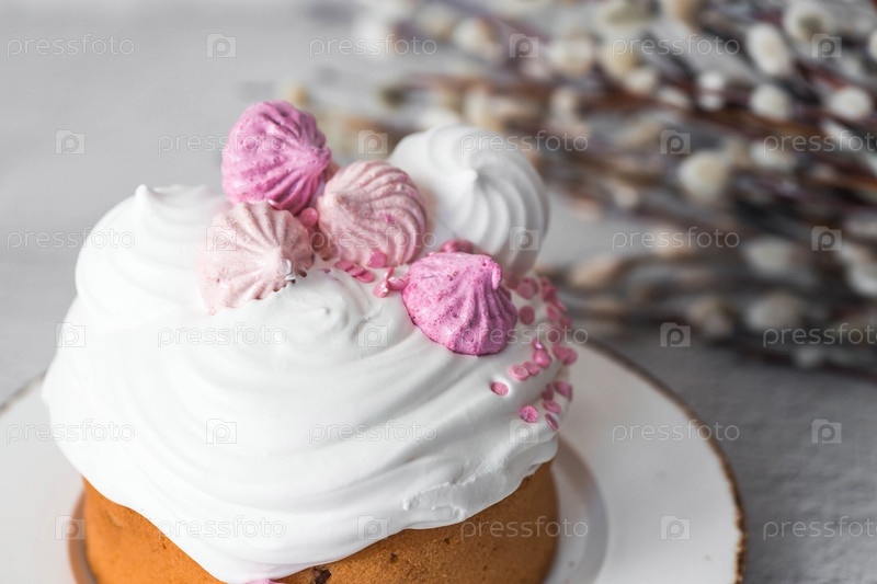 Красивый стильный натюрморт. Пасхальный кулич с безе, зефиром, пасхальными яйцами и веточками ивы на светлом бетонном фоне. счастливой Пасхи 2024