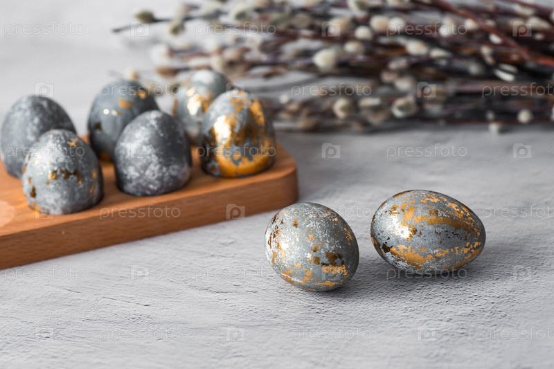 Стильные серые пасхальные яйца из мрамора и бетона с золотой поталой на сером фоне. Окраска яиц натуральным красителем чай каркаде. . Концепция счастливой Пасхи