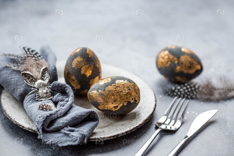 Баннер. Сервировка стола. Модная бетонная тарелка с кроликом на салфетке, пасхальные яйца с позолотой, перья на сером фоне. Концепция праздника Светлой Пасхи для кафе и ресторанов