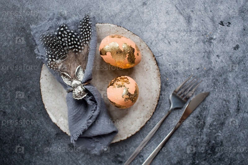 Баннер. Сервировка стола. Модная бетонная тарелка с кроликом на салфетке, пасхальные яйца с позолотой, перья на сером фоне. Концепция праздника Светлой Пасхи для кафе и ресторанов