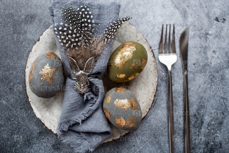 Баннер. Сервировка стола. Модная бетонная тарелка с кроликом на салфетке, пасхальные яйца с позолотой, перья на сером фоне. Концепция праздника Светлой Пасхи для кафе и ресторанов
