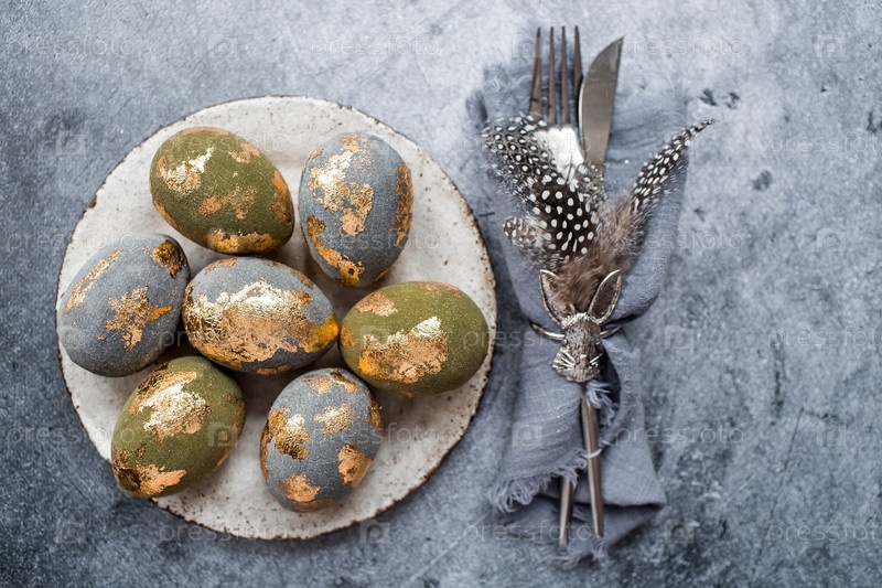 Баннер. Сервировка стола. Модная бетонная тарелка с кроликом на салфетке, пасхальные яйца с позолотой, перья на сером фоне. Концепция праздника Светлой Пасхи для кафе и ресторанов