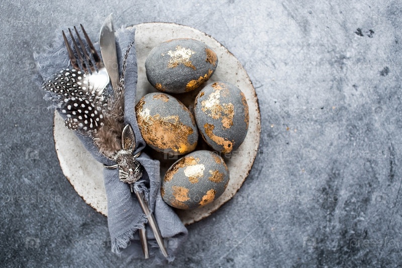 Баннер. Сервировка стола. Модная бетонная тарелка с кроликом на салфетке, пасхальные яйца с позолотой, перья на сером фоне. Концепция праздника Светлой Пасхи для кафе и ресторанов