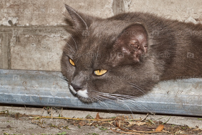 В жаркий летний день кот ищет прохладное место и отдыхает