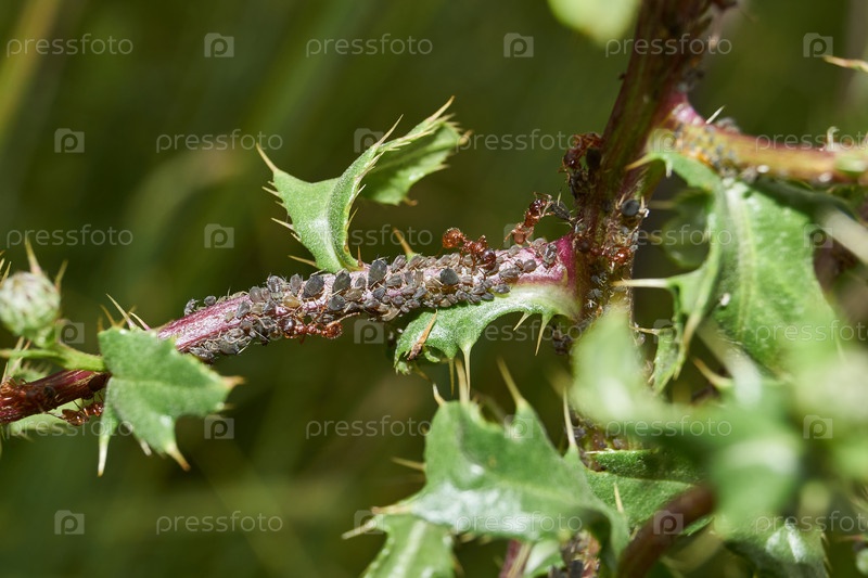 Симбиоз муравьев и тли. Муравей щекочет тлю усиками, и она выделяет каплю сладкой жидкости
