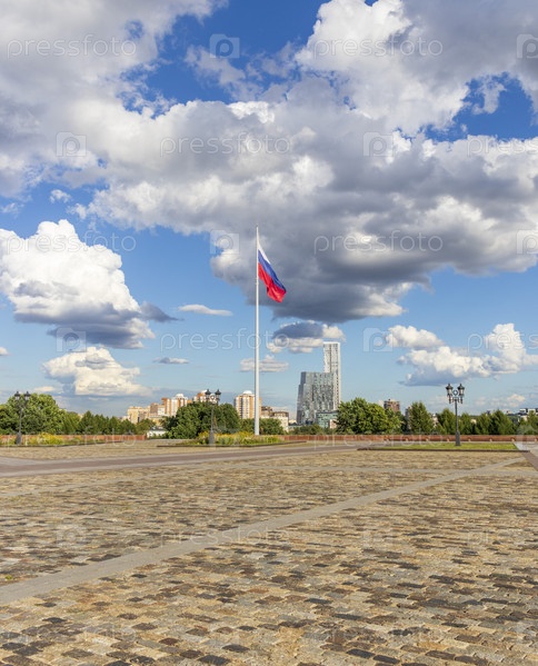 Крупный план российского флага, развевающегося на ветру. Страна