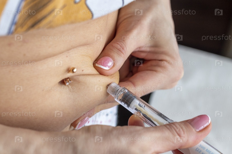 Крупный план женщины с красивыми руками, готовящей гормональные лекарства и делающей себе инъекцию в живот с проколотым пупком. Здравоохранение